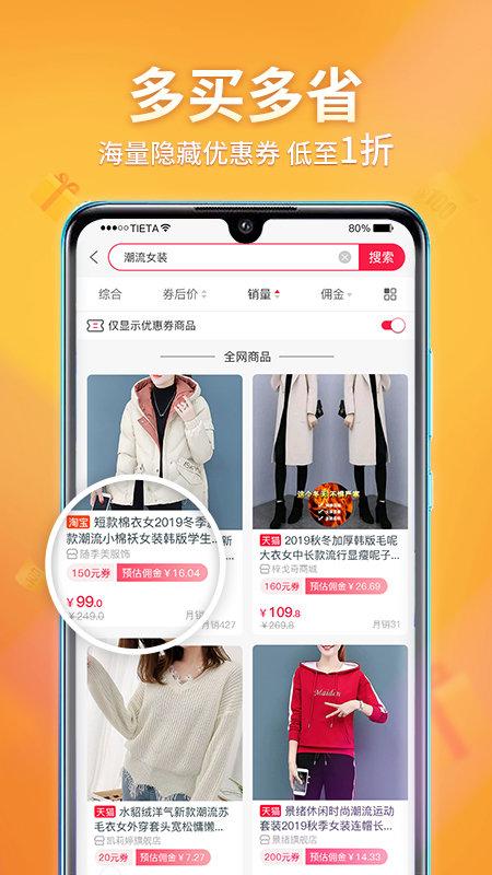 网购达人的省钱工具!整合成千上万的电商商家,每天呈现大量的品类实惠、高折扣的商品,及每天更新海量大额优惠券。可以实现让你每天赚点收益,面膜钱又存好了。
